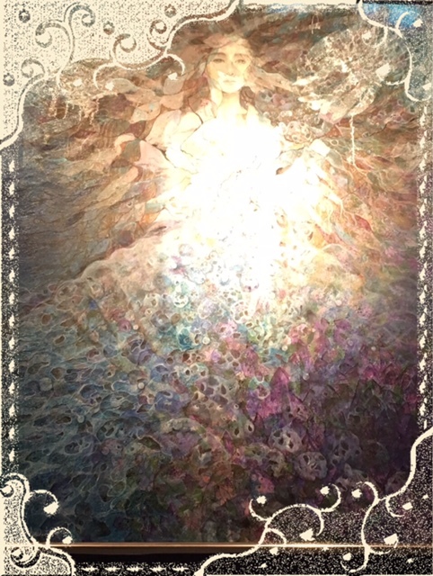 ステンドグラスが胸元から光を放ち割れていくような描写